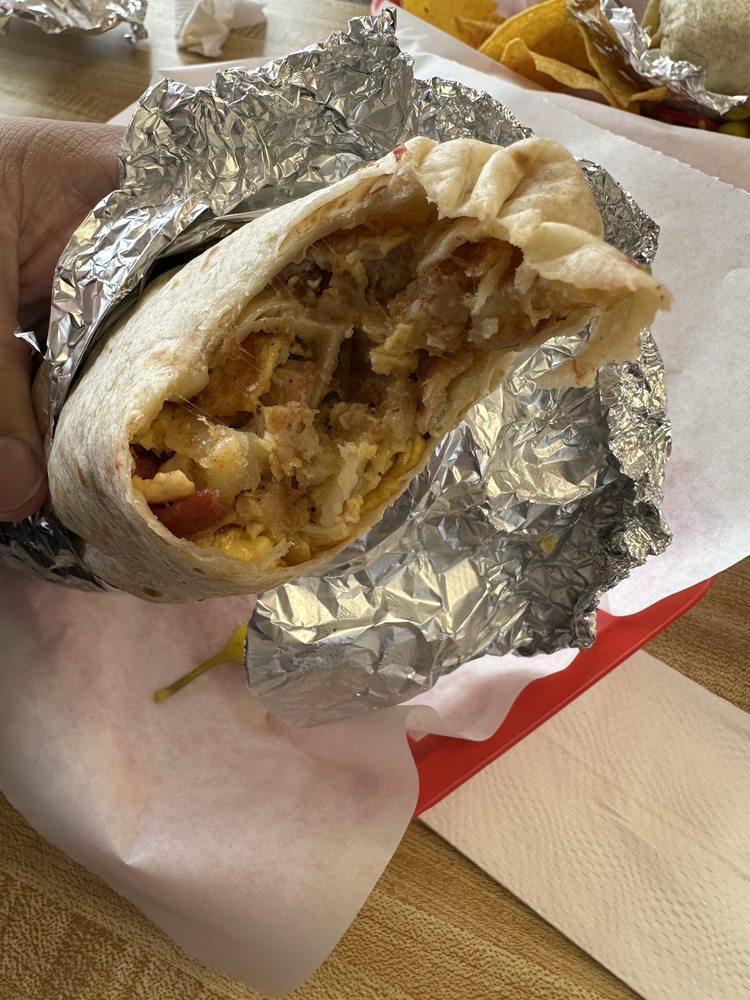Bacon, Eggs, Hash Brown and Cheese Burrito