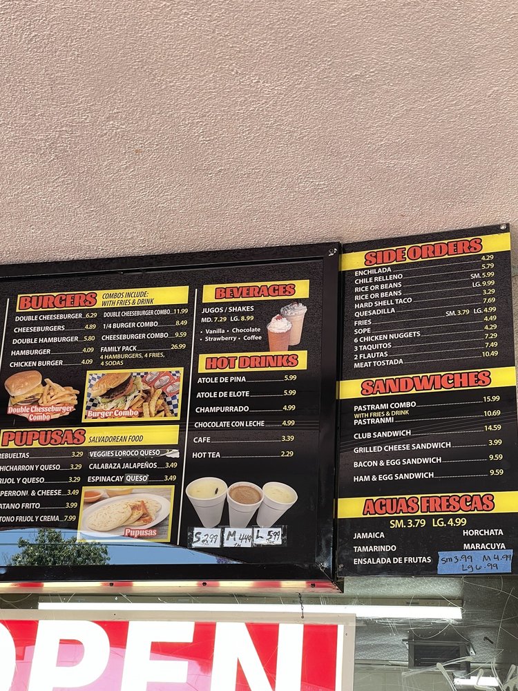 Protein: chicharron queso y frijol. Frijol & queso. Peperoni & queso. Queso. Loroco & queso. Espinaca & queso. Calabaza & queso. Jalapeno & queso.